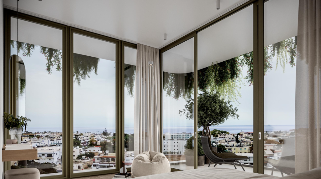 Các căn hộ được thiết kế với cửa sổ kính trong suốt từ trần đến sàn, giúp chủ nhân ngắm trọn khung cảnh biển Địa Trung Hải và thành phố Paphos lung linh về đêm. Mỗi căn đều có ban công riêng rộng rãi, sân thượng có mái che, và không gian mở kết nối liền mạch giữa phòng khách – phòng ăn – bếp.